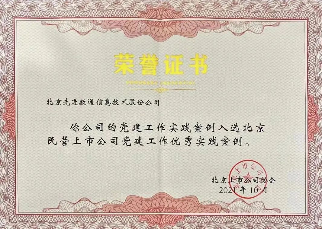 近期,北京上市公司协会授予北京美港通官网信息技术股份公司荣誉证书,美港通官网党建工作实践入选北京民营上市公司党建工作优秀实践案例,相关党建活动已收录在《北京民营上市公司党建工作优秀实践案例汇编》。